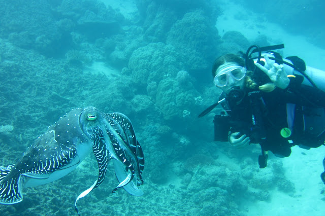 And this one is of me with a cuttlefish! Isn't he super adorable?! And they can change colour! I wanted to grab him and take him home with me forever, but unfortunately they're likely to grab you with their tentacles and rip your flesh apart with their beaks.